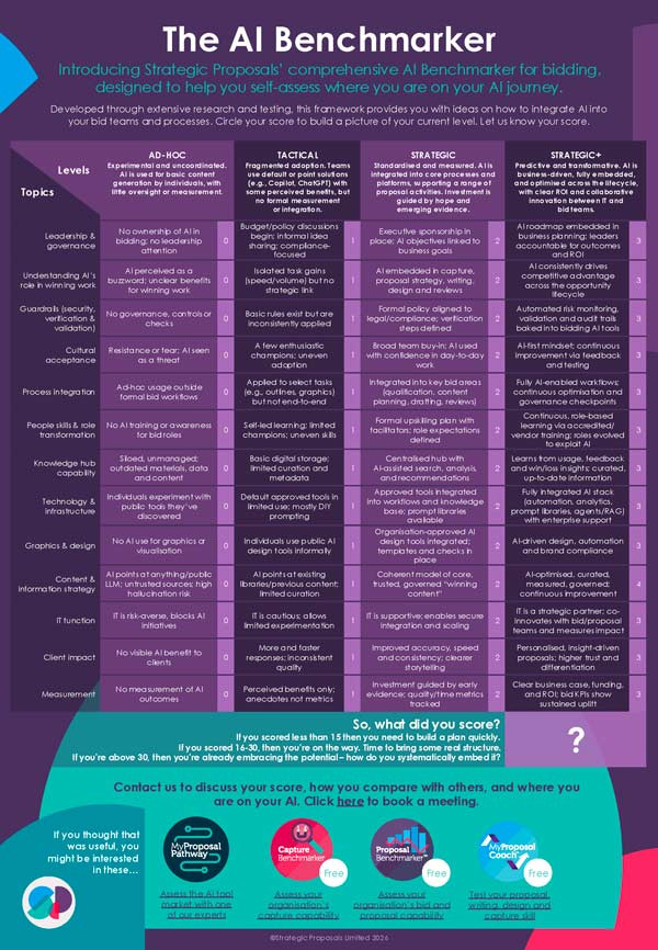 Built from Strategic Proposals' work on benchmarking and AI adoption in bids, the tool covers thirteen areas from leadership and guardrails to integration, skills, content and client impact. Score yourself (0–3), see your band, and book a short call to compare against peers and discuss a roadmap.